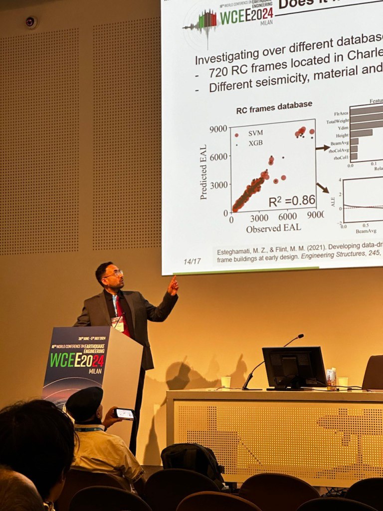 6/30-7/5: Dr. Esteghamati attended the 12th World Conference on Earthquake Engineering in Milan, presented a stage presentation on a neural-network-based computational platform for seismic performance assessment, and moderated a session on AI for design and assessment. Great to get connected to colleagues and friends in the broader community of earthquake engineering!
