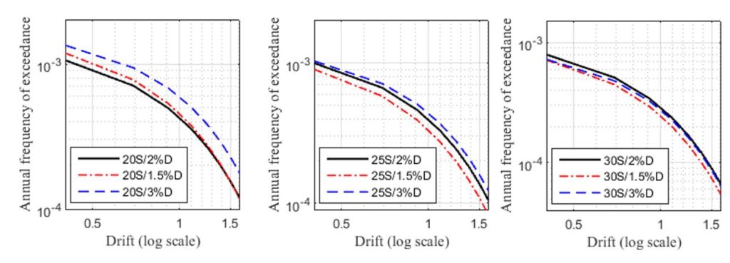 Drift criteria governs the code-based design of tall buildings. In this study we used probabilistic methods to compare the seismic performance of code-based and beyond- code design of high-rise shear wall-frame RC structures in respect to drift criteria. Three different design alternatives (code-based, beyond-code, lower than code) are investigated for 20-, 25- and 30-story buildings.